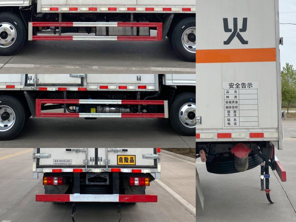 其它 | 1、該車為危險品運輸車.運輸具有獨立容器(瓶)包裝的易燃液體物品.運送危險物品類項號:3類.廂體頂部封閉不可開啟.2、側,后防護材料均為Q235,側防護螺栓連接,后防護焊接,截面尺寸(mm):100×50,下邊緣離地高430mm.3、整備質(zhì)量含備胎,滅火器及隨車工具;貨廂重量為1090kg;材質(zhì)/厚度:復合板結構廂體:底板材質(zhì)為Q235,厚度3mm,側板為外Q235+中間阻燃泡沫+內(nèi)純鋁板,厚度42mm;瓦楞板結構廂體:底板材質(zhì)為Q235,厚度3mm,側板為Q235,厚度1.5mm.4、僅選用排氣管前置、限速裝置(限速80km/h)、前輪盤式制動及子午線輪胎的底盤,轉向輪安裝輪胎爆胎應急防護裝置,安裝具有衛(wèi)星定位功能的行駛記錄儀.ABS系統(tǒng)控制器型號/生產(chǎn)企業(yè): APG3550500A/浙江亞太機電股份有限公司,3550B500/浙江亞太機電股份有限公司,VIE ABS-II/浙江萬安科技股份有限公司.發(fā)動機/油耗值(L/100km)對應關系為:JX493ZLQ6D/10.75,JX4D25A6H/10.83.隨底盤選裝駕駛室,選裝白色中網(wǎng),選裝白色前保,選裝黑色前保,選裝廂體側面選裝開門型式及位置,選裝不帶側開門,選裝貨廂平面或瓦楞結構;廂體側面選裝開百葉窗,選裝后部樣式,該車可選裝直接供電式ETC車載裝置. | ||