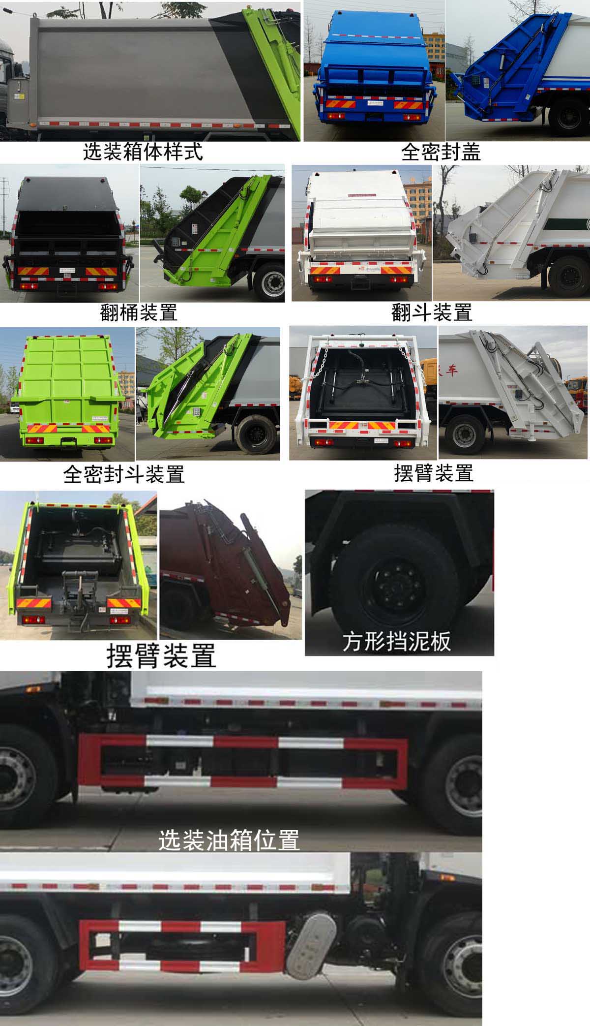 | 配置 | 1、該車主要專用裝置由箱體、壓縮系統(tǒng)組成,用于垃圾的收集與清運(yùn)。該車可選裝方形或弧形箱體,選裝全密封蓋裝置,選裝方形擋泥板,選裝后部工作裝置,選裝側(cè)防護(hù)樣式。選裝工作裝置時(shí)外形長(zhǎng)/前懸/軸距/后伸對(duì)應(yīng)關(guān)系為(mm):①無上料裝置:8670/1400/4500/-;8700/1430/4500/-;8870/1400/4700/-;8900/1430/4700/-;②全密封斗裝置和擺臂裝置:8870/1400/4500/200;8900/1430/4500/200;9070/1400/4700/200;9100/1430/4700/200;③翻桶裝置和翻斗裝置:9070/1400/4500/400;9100/1430/4500/400;9270/1400/4700/400;9300/1430/4700/400。僅采用4500mm,4700mm軸距。2、側(cè)防護(hù)采用冷彎型鋼/Q235,螺栓連接;后防護(hù)由專用裝置替代,下邊緣離地高:500mm。3、隨底盤選裝高度不同的駕駛室;選裝前霧燈;選裝駕駛室頂部裝飾燈;選裝駕駛室前面罩;選裝前保險(xiǎn)杠及前部燈具,駕駛室前臉擾流罩為選裝件;駕駛室臥鋪側(cè)窗選裝裝飾板;選裝油箱安裝位置,選裝踏步結(jié)構(gòu)。安裝帶有衛(wèi)星定位功能的行駛記錄儀。ABS型號(hào)/生產(chǎn)廠家:3631010-C2000/東科克諾爾商用車制動(dòng)系統(tǒng)(十堰)有限公司,ABS 8/東科克諾爾商用車制動(dòng)系統(tǒng)(十堰)有限公司, 4460046450/威伯科汽車**系統(tǒng)(**)有限公司。采用的發(fā)動(dòng)機(jī)與油耗值對(duì)應(yīng)關(guān)系為(L/100Km):DDi50E190-60/23.9,D4.5NS6B190/24.4,D6.7NS6B230/23.7,B6.2NS6B210/23.8,B6.2NS6B230/23.8。 | ||